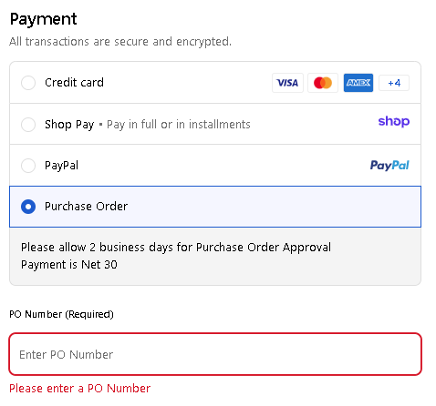 As an approved school customer, you can enter your authorized purchase order number directly under “Payment”: